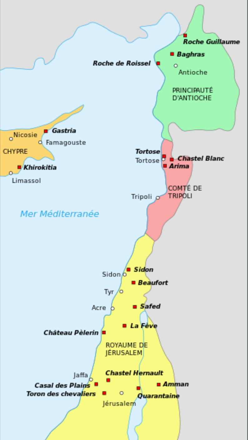 Au XIIIe siècle, dans le royaume de Jérusalem, les Templiers possédaient quatre forteresses : le château Pèlerin construit en 1217-1218, la forteresse de Safed reconstruite en 1240-1243, le château de Sidon et la forteresse de Beaufort tous deux cédés par Julien, seigneur de Sidon en 1260.